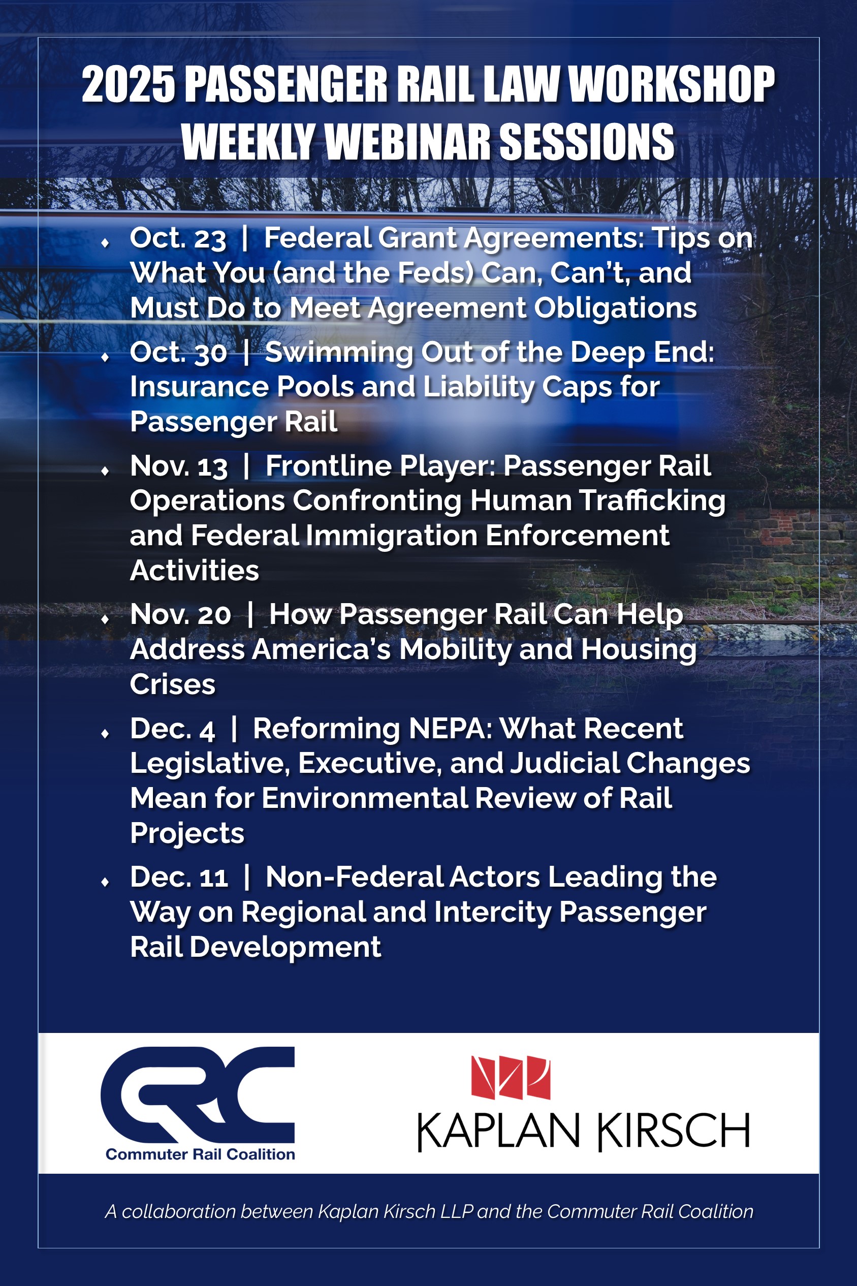 Kaplan Kirsch LLP, in cooperation with the Commuter Rail Coalition, presented the 2025 Passenger Rail Law Workshop virtually. This year’s workshop was a series of webinars taking place between October 23 and December 11, 2025.